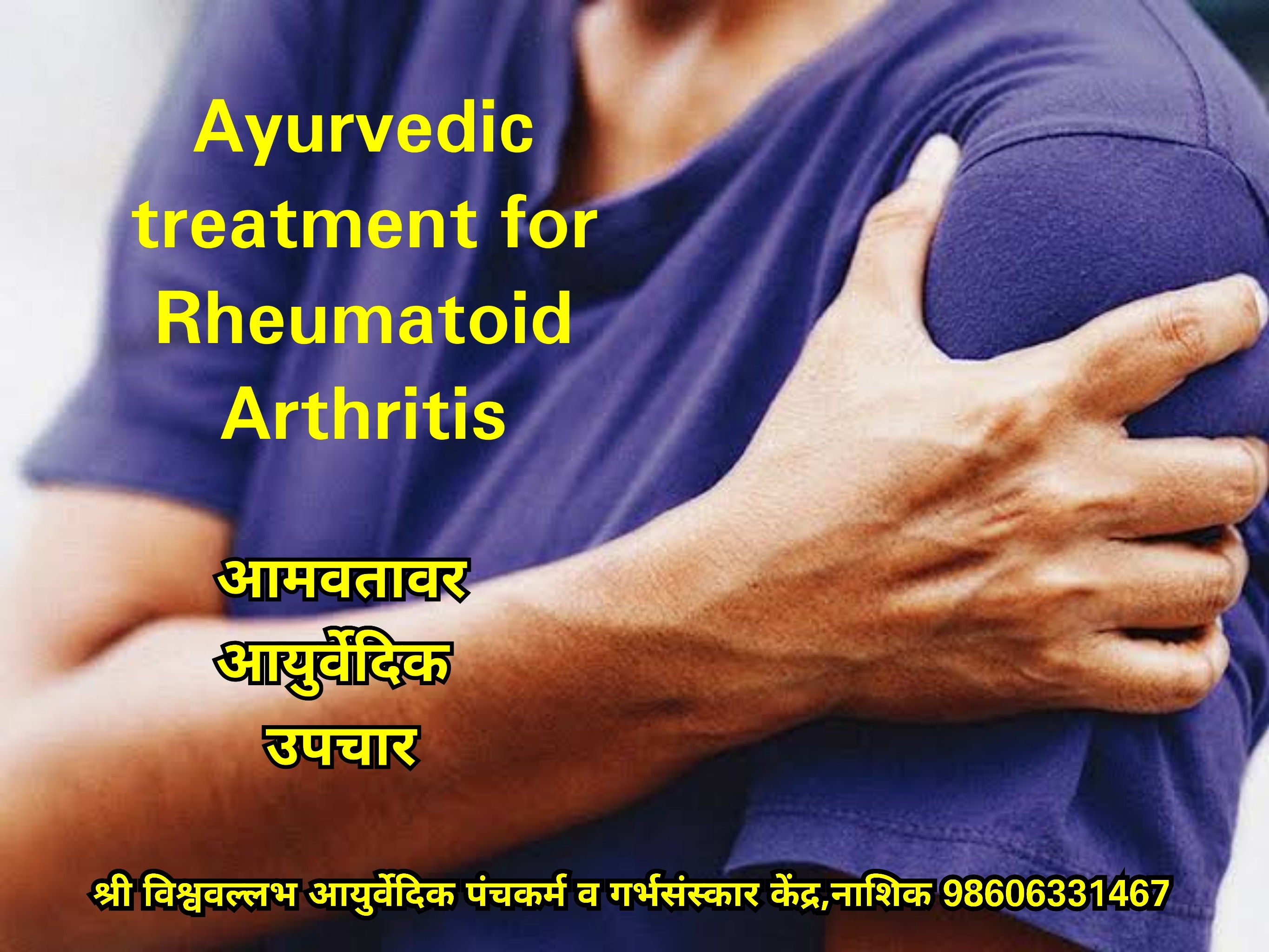 Rheumatoid Arthritis Rheumatoid arthritis (RA) is a chronic inflammatory disease of unknown etiology characterized by a symmetric polyarthritis, the most common form of chronic inflammatory arthritis. Since persistently active RA often results in articular cartilage and bone destruction and functional disability, it is vital to diagnose and treat this disease early and aggressively before the damage occurs . Treatment Internally Herbal / Herbo mineral medicine according to prakruti of patients and cause of disease. Panchkarma - Snehan , Swedan , Virechan , Vaman , Basti , Janu dhara , Janu basti , Kati basti , Sarvang dhara ,Kanji dhara, Pinda sweda , Jalauka awchara (Leech therapy) , Upnaha , Path Bandhani , agnikarma , etc आमवात सांध्यांचे विकार आमवात हा एक तीव्र दाहक रोग आहे जो सिमेट्रिक पॉलीआर्थरायटिस द्वारे दर्शविला जातो, जो तीव्र दाहक आमवातचा सर्वात सामान्य प्रकार आहे. सतत सक्रिय आमवातमुळे बर्याचदा सांध्यासंबंधी उपास्थि आणि हाडांचा नाश होतो आणि कार्यात्मक अपंगत्व येते, नुकसान होण्यापूर्वी या रोगाचे लवकर आणि आक्रमक निदान करणे आणि त्यावर उपचार करणे आवश्यक आहे. आयुर्वेदिक उपचार अंतर्गत आयुर्वेदिक वनौषधी रूग्णांच्या प्रकृतीनुसार आणि रोगास नाशक औषध. पंचकर्म स्नेहन, स्वेदन, विरेचन, वमन, बस्ती, जानू धारा, जानू बस्ती, कटी बस्ती, सर्वांगधारा, कांजी धारि, पिंडा स्वेद,जलौका, उपनह, पाठबांधनी, अग्निकर्म इ.